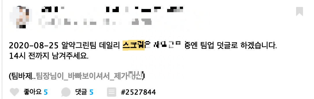 필자의 팀은 그래서 데일리 스크럼을 사내 메신저 게시판을 통해 진행하고 있다. 팀장님이 데일리 스크럼 글을 올려주시면 개인이 진행 중인 업무에 대해 짧게 or TMI로 공유를 하게 된다.