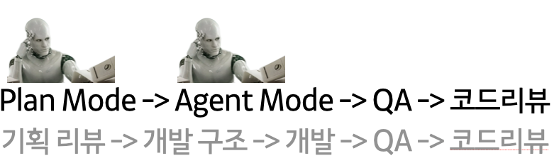 Plan -> Plan Review -> Agent Mode -> 코드 리뷰 -> Test